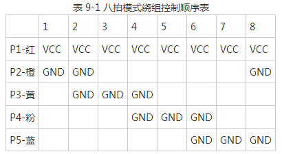 再重新看一下上面的步进电机外观图和内部结构图:步进电机一共有5根引线,其中红色的是公共端,连接到 5 V 电源,接下来的橙、黄、粉、蓝就对应了 A、B、C、D 相;那么如果要导通 A 相绕组,就只需将橙色线接地即可,B 相则黄色接地,依此类推;再根据上述单四拍和八拍工作过程的讲解,可以得出下面的绕组控制顺序表,如表9-1所示: