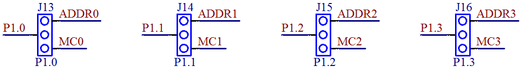 我们板子上控制步进电机部分是和板子上的显示控制的 74HC138 译码器部分复用的 P1.0~P1.3,关于跳线我们在第3章已经讲过了,通过调整跳线帽的位置可以让 P1.0~P1.3控制步进电机的四个绕组,如图9-5所示。