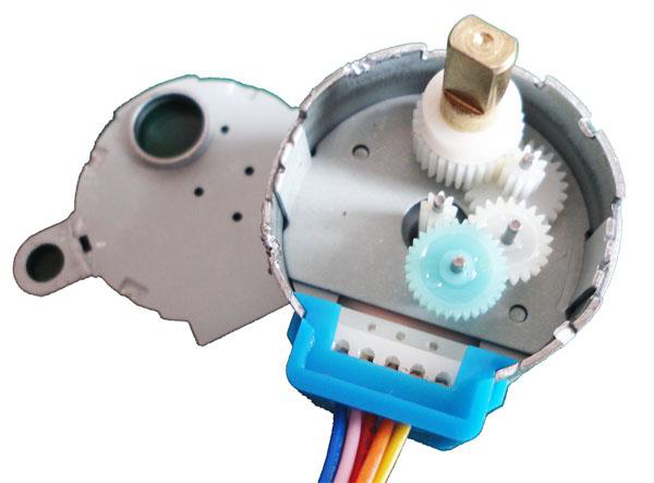 那么,是时候来了解“永磁式减速步进电机”中这个“减速”的概念了。图9-7是这个 28BYJ-48 步进电机的拆解图,从图中可以看到,位于最中心的那个白色小齿轮才是步进电机的转子输出,64个节拍只是让这个小齿轮转了一圈,然后它带动那个浅蓝色的大齿轮,这就是一级减速。大家看一下右上方的白色齿轮的结构,除电机转子和最终输出轴外的3个传动齿轮都是这样的结构,由一层多齿和一层少齿构成,而每一个齿轮都用自己的少齿层去驱动下一个齿轮的多齿层,这样每2个齿轮都构成一级减速,一共就有了4级减速,那么总的减速比是多少呢?即转子要转多少圈最终输出轴才转一圈呢?