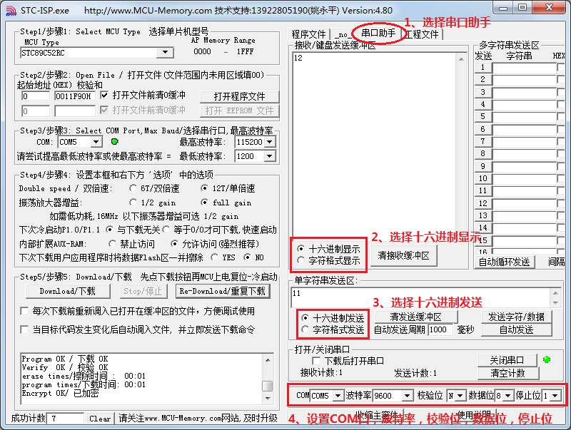 串口调试助手,这里我们直接使用 STC-ISP 软件自带的串口调试助手,先把串口调试助手的使用给大家说一下,如图11-6所示。第一步要选择串口助手菜单,第二步选择十六进制显示,第三步选择十六进制发送,第四步选择 COM 口,这个 COM 口要和自己电脑设备管理器里的那个 COM 口一致,波特率按我们程序设定好的选择,我们程序中让一个数据位持续时间是1/9600秒,那这个地方选择波特率就是选9600,校验位选 N,数据位8,停止位1。