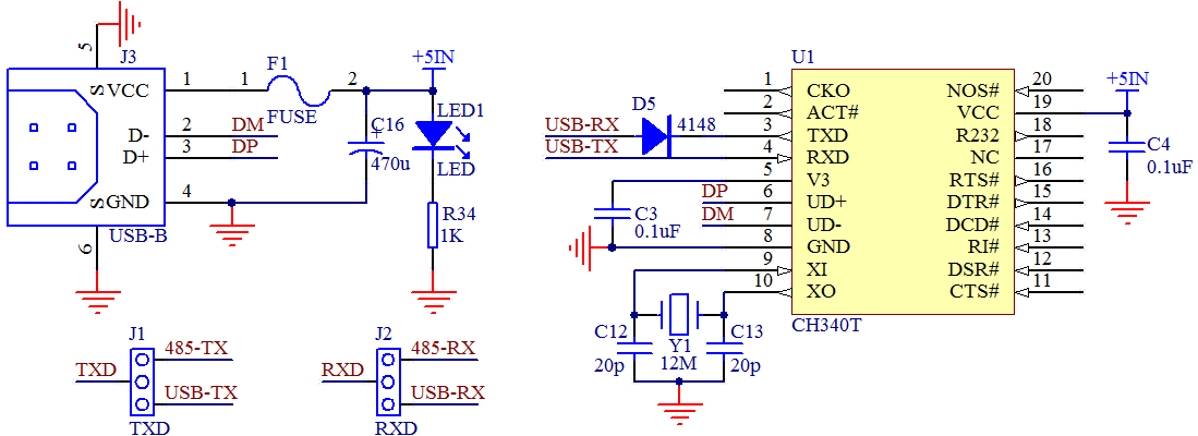 图中左下方 J1 和 J2 是两个跳线的组合,大家可以在我们板子左下方的位置找到,我们需要用跳线帽把中间和下边的针短接在一起。右侧的 CH340T 这个电路很简单,把电源、晶振接好后,6脚和7脚的 DP 和 DM 分别接 USB 口的2个数据引脚上去,3脚和4脚通过跳线接到了我们单片机的 TXD 和 RXD 上去。