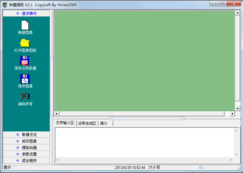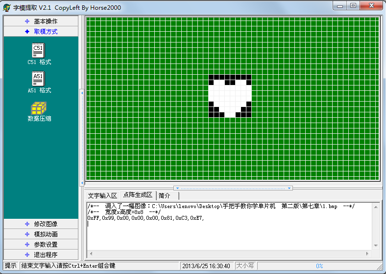 我们要显示花样的时候,往往要先做出来一些小图形,这些小图形的数据要转换到我们的程序当中去,这个时候就需要取模软件。给大家介绍一款简单的取模软件,这种取模软件在网上都可以下载到,大家来了解一下如何使用,先看一下操作界面,如图7-3所示。