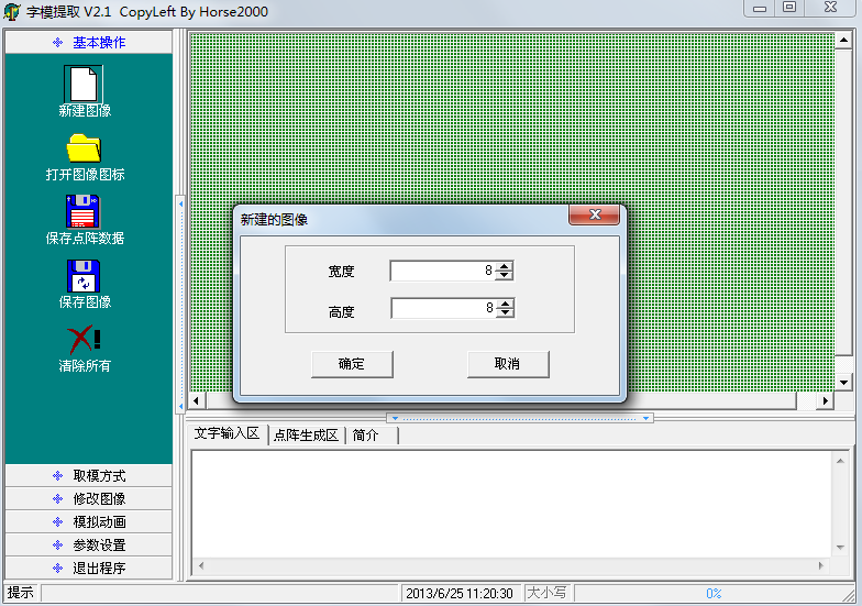 鼠标点一下“新建图形”,根据我们板子上的点阵,把宽度和高度分别改成8,然后点确定,如图7-4所示。