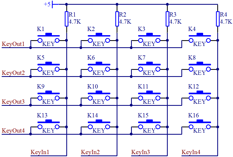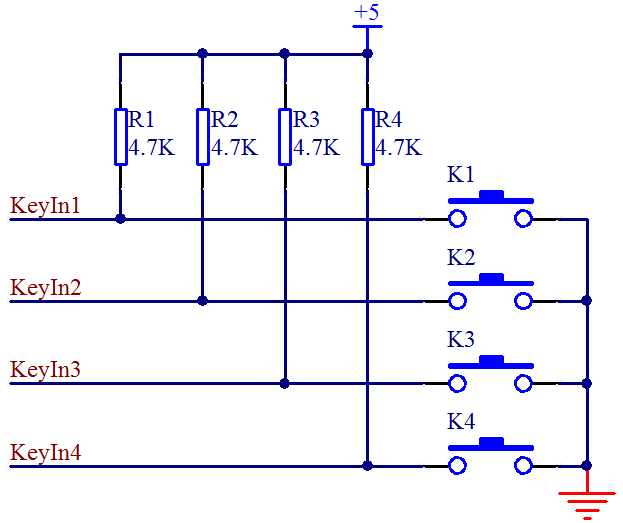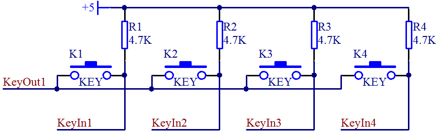 4条输入线接到单片机的 IO 口上,当按键 K1 按下时,+5 V 通过电阻 R1 然后再通过按键 K1 最终进入 GND 形成一条通路,那么这条线路的全部电压都加到了 R1 这个电阻上,KeyIn1 这个引脚就是个低电平。当松开按键后,线路断开,就不会有电流通过,那么 KeyIn1 和 +5 V 就应该是等电位,是一个高电平。我们就可以通过 KeyIn1 这个 IO 口的高低电平来判断是否有按键按下。