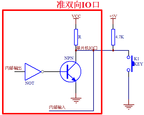 当内部输出是高电平,经过一个反向器变成低电平,NPN 三极管不会导通,那么单片机 IO 口从内部来看,由于上拉电阻 R 的存在,所以是一个高电平。当外部没有按键按下将电平拉低的话,VCC 也是 +5 V,它们之间虽然有2个电阻,但是没有压差,就不会有电流,线上所有的位置都是高电平,这个时候我们就可以正常读取到按键的状态了。