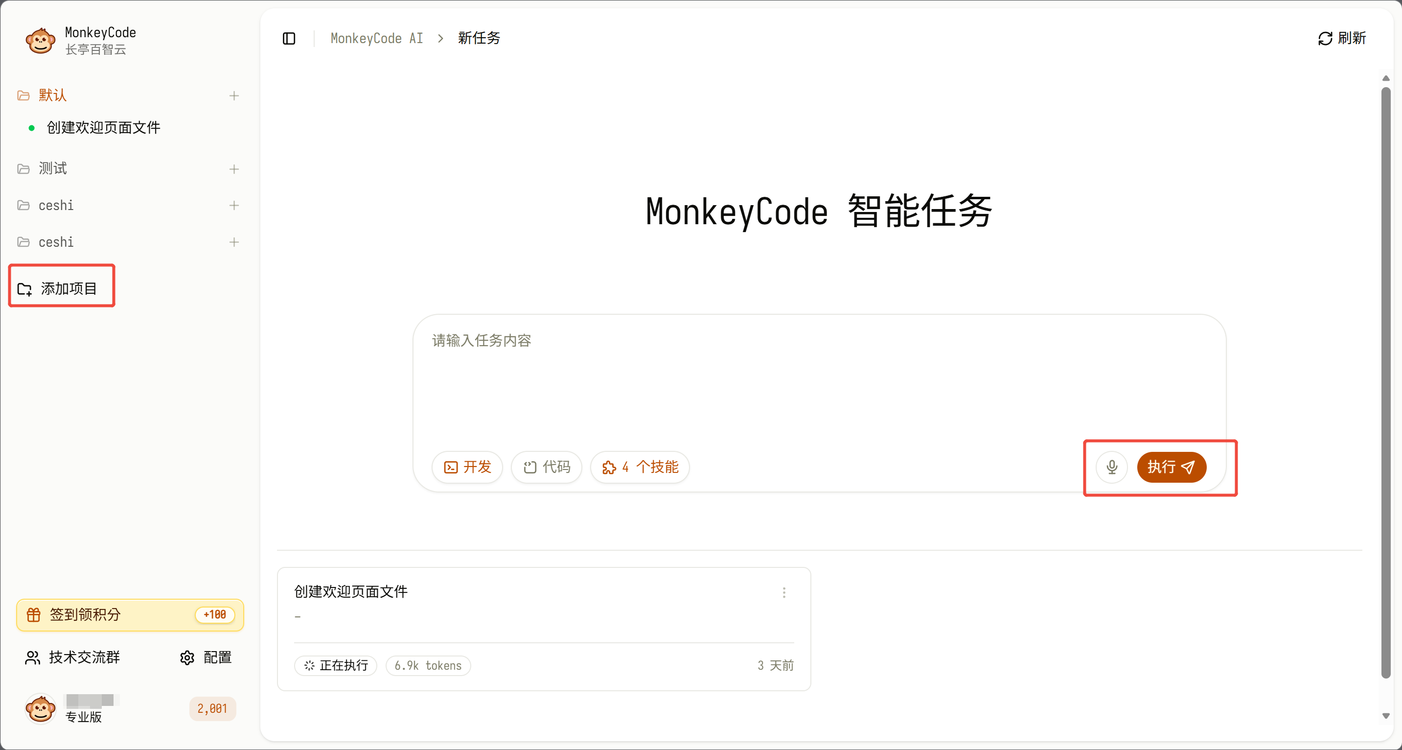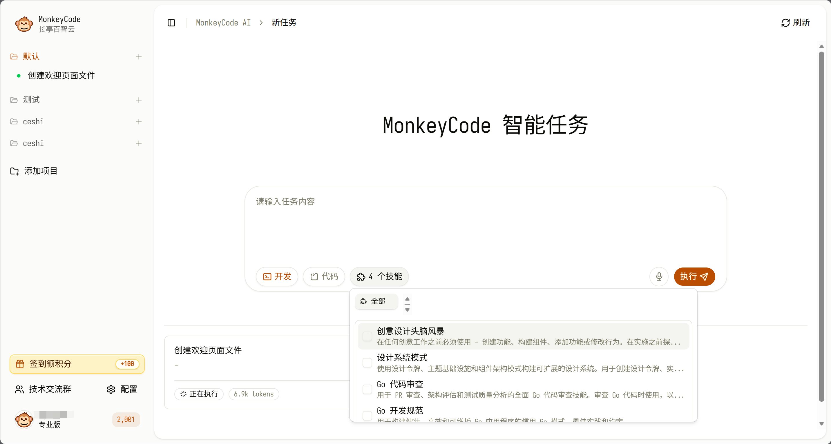 在主界面对话框中精准描述任务需求(如功能开发、Bug 修复、代码优化等),并可根据项目类型选择匹配的技能模板,提交后平台将自动解析需求并执行。