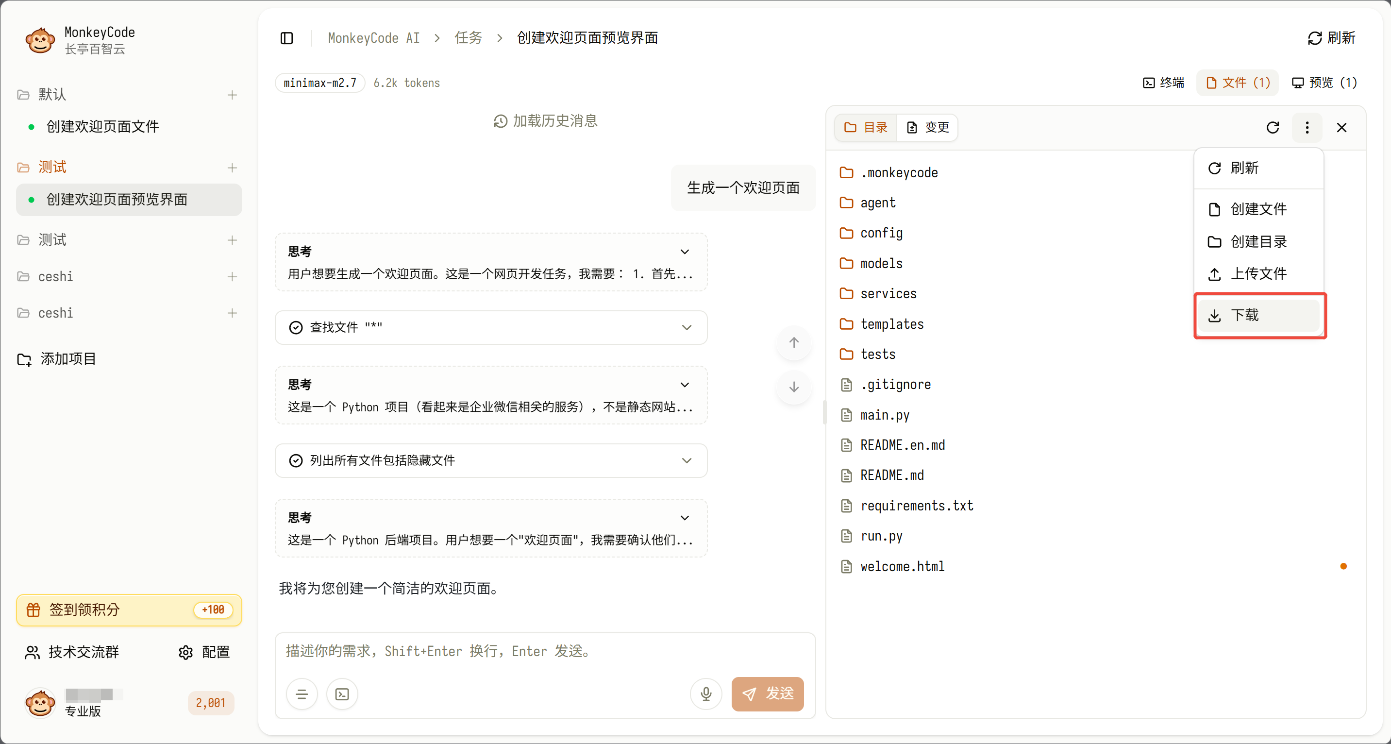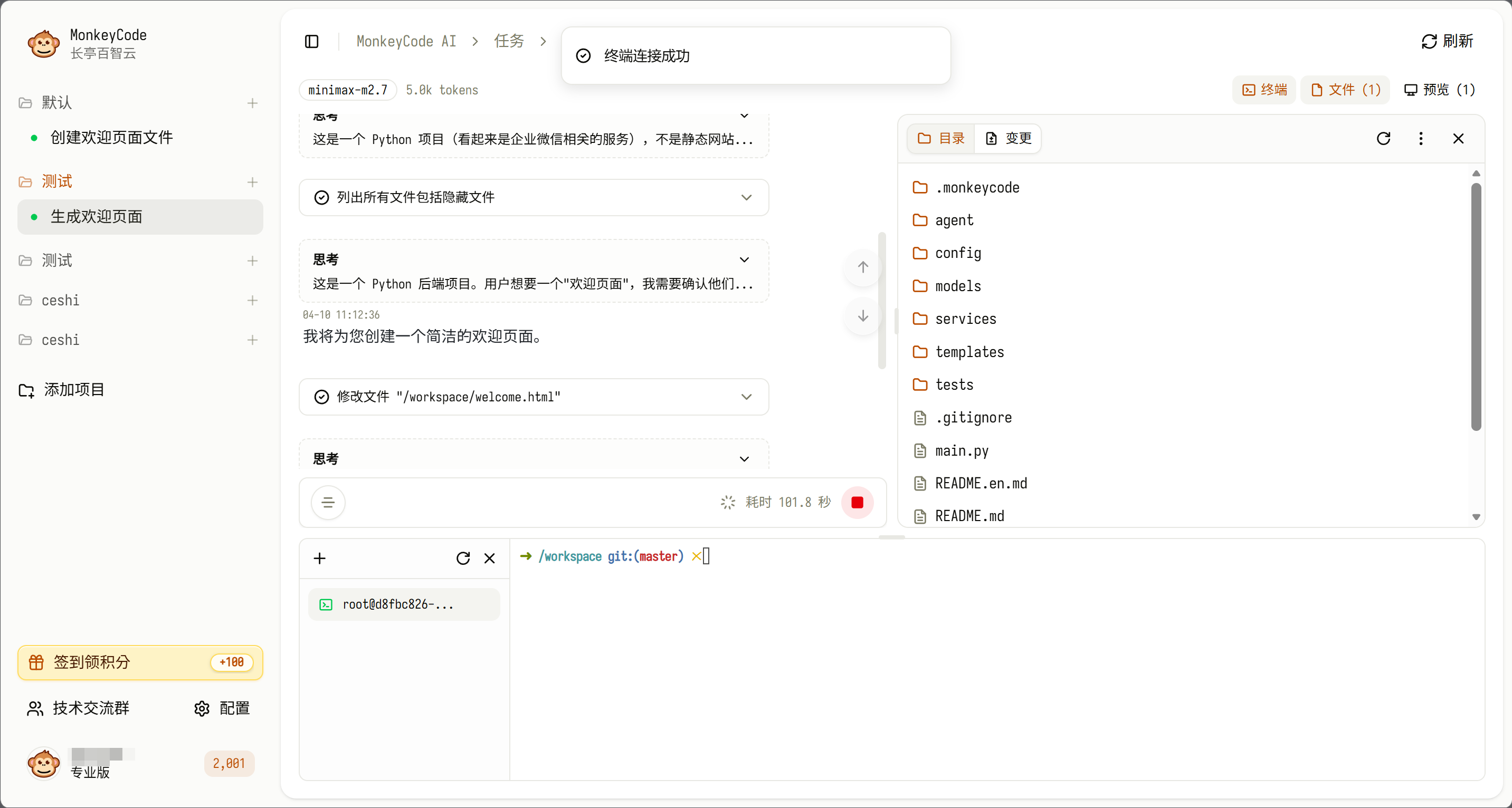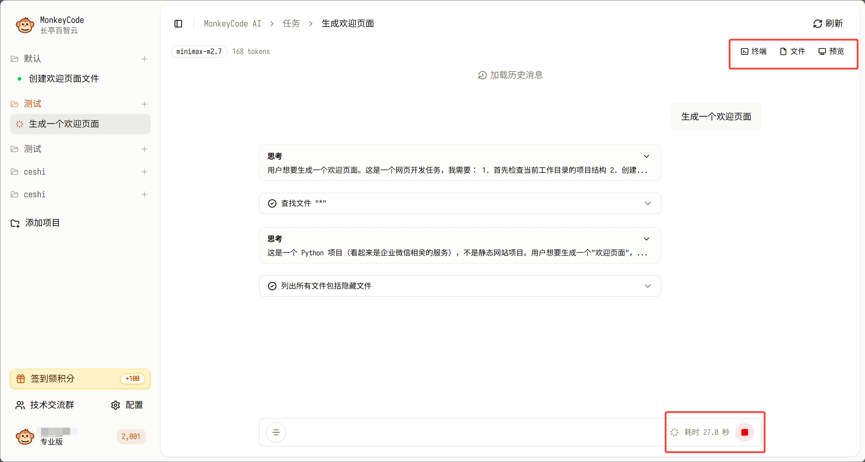 进度可视化:任务执行期间,界面将展示详细的执行步骤、各步骤耗时,右侧面板可查看项目文件结构、变更文件预览等核心信息。在“文件”中上传或下载需要文件,在“终端”采用终端命令的方式进行测试。