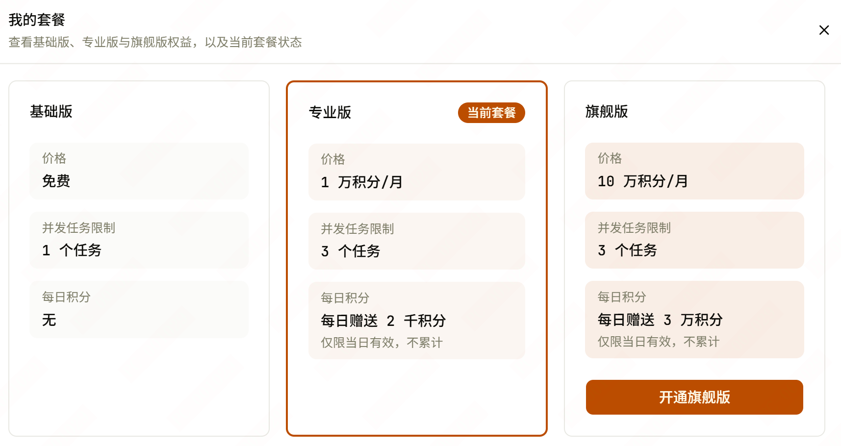 专业版支持最多同时运行3个任务。能够选择更多的AI模型(gpt、minimax、glm、kimi、mimo、deepseek 等多种模型)。