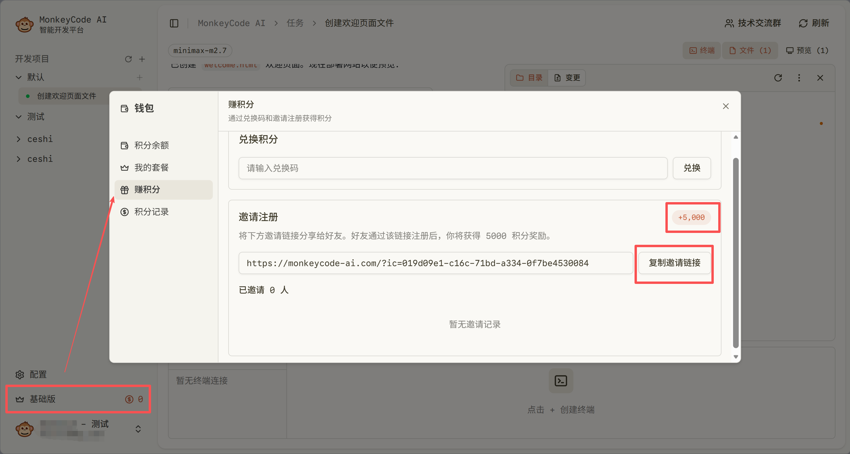 详情查看:如何免费白嫖MonkeyCode积分