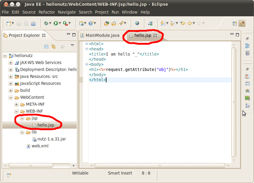 我们需要在 WEB-INF 下面建立一个名为 jsp 的文件夹,并在里面建立一个 hello.jsp