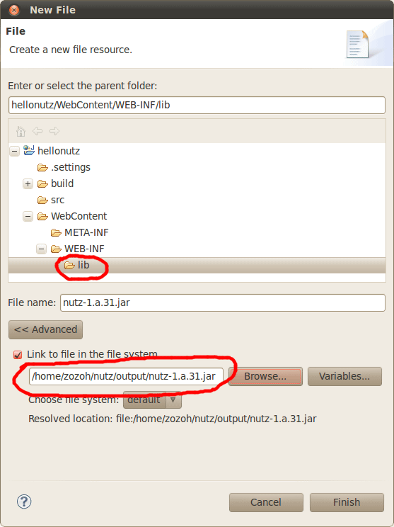 点击 'Finish' Eclipse 会将 nutz 的 jar 链到项目中