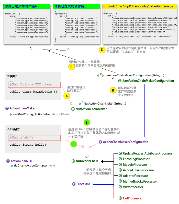 如果你采用的是 Nutz.Mvc 的默认动作链工厂,它允许你在构造函数中声明动作链的配置文件。 你可以增加任意多的动作链配置文件,在一个文件中,你可以声明任意多的动作链。