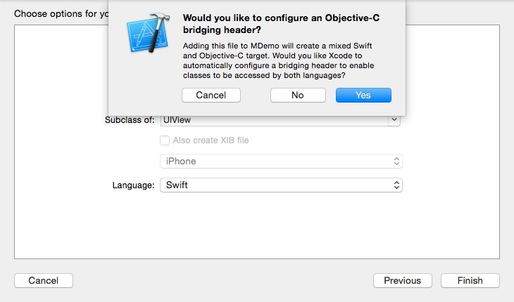 添加 Swift 文件时 Xcode 会自动提示你添加 bridging header 文件,选择 Yes 即可