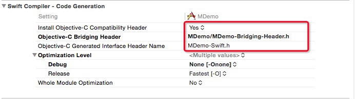 这两处设置 Xcode 默认都会设置好,可以把 objective-c Bridging Header 和 Objective-C Generated Interface Header Name 改成自己想设置的名字。