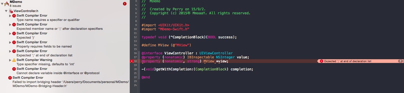这里是因为我使用 #define MView (@"MView") 将 MView 定义成了 NSString 类型的宏,而在 Swift 中 MView 是 UIView 的子类,在 #import "MDemo-Swift.h" 之后, MView 就被重复定义了,从而导致错误。