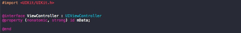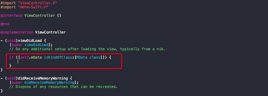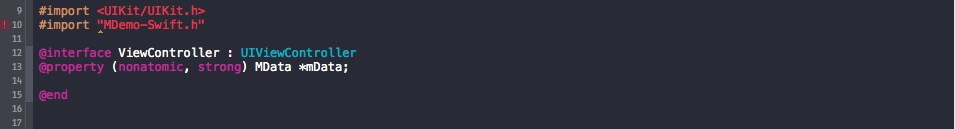 在这种场景下,就会出现重复包含,因为已经有了 MManager 类中的一个方法需要传入 ViewController 类实例的句柄 这样一个条件,所以我们必须在 XXX-Bridging-Header.h 中 #import "ViewController.h",这样我们就只能通过在 ViewController.m 文件中去 #import "XXX-Swift.h" 的方式来避免重复包含。此时我们需要将成员变量 mData 定义为 id 类型,当在ViewController.m 文件中具体用的时候再将其强制转换为 MData 类型。如下: