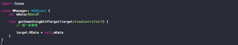 然后,MManager 类中的一个方法需要传入 ViewController 类实例的句柄,然后把一个 MData 类实例赋值给 ViewController 类实例中的成员变量 mData(这个 mData 的类型是 MData )。