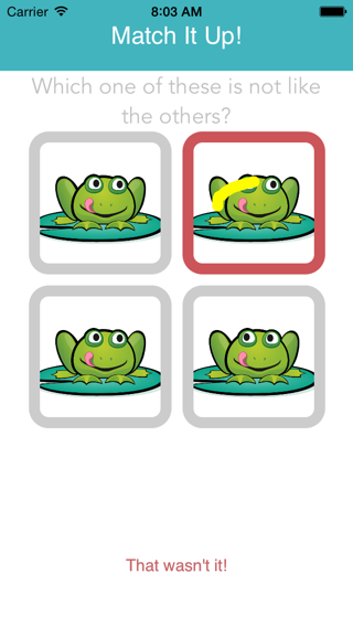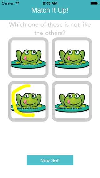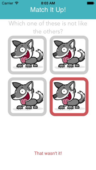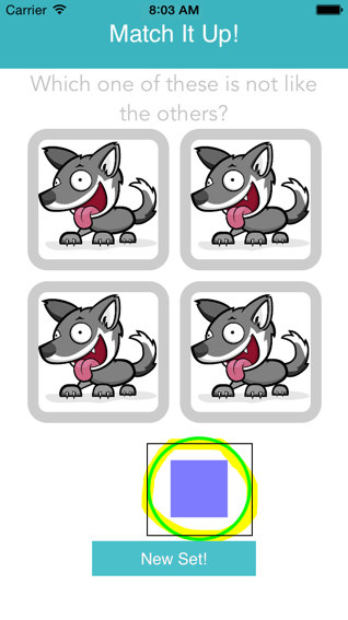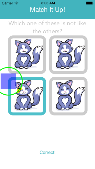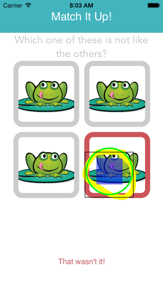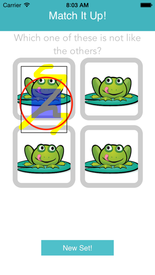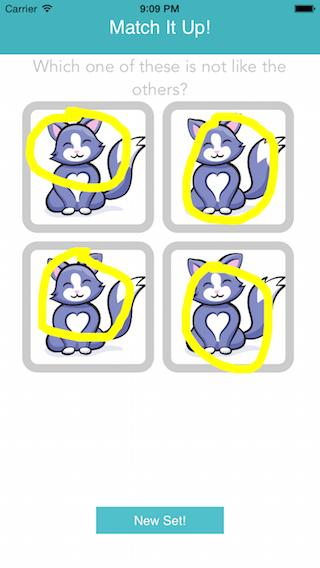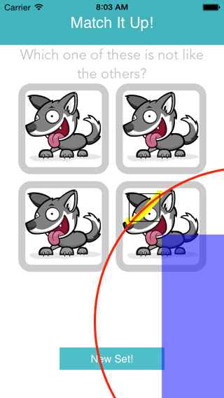 MatchItUp 向用户展示4张图片,3张是一致的,另外1张和其他的略有不同。用户的任务就是通过用手指在上面画一个圆圈的方式找出不同的那张: