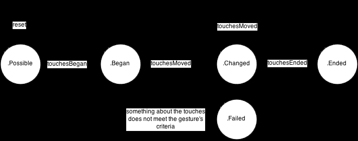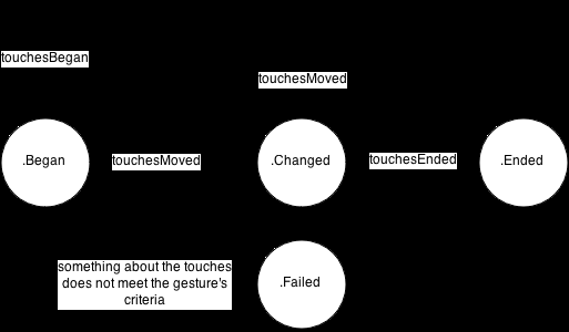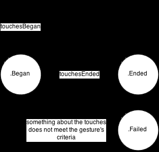 这里要想你介绍手势识别器的第三种状态:.Failed。.Ended 表示手势成功完成,而.Failed表示用户的手势不是你想要的。