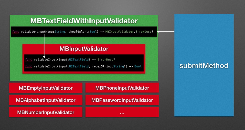 MBInputValidator:验证器基类,负责提供统一的接口供MBTextFieldWithInputValidator调用,验证器子类通过继承并重写其验证策略方法即可以实现具体的验证策略。MBTextFieldWithInputValidator:UITextField子类,负责提供统一的外部接口供业务代码调用以及验证出错时弹出告警信息。