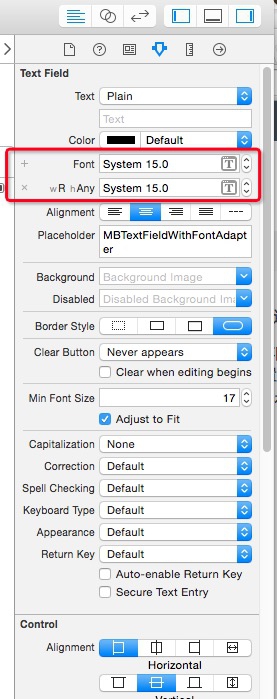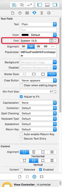 然后就是字体的初始大小的设置问题。根据UI设计,不同的地方字体的大小肯定不一样,所以还是要手动设置一次的,我们app的字体是完全按照UI给定的大小来设置的(只是在iPhone6和iPhone6Plus上会做相应的字号放大),如果是代码生成则调用控件setFont方法,如果是storyboard和xib则在下图红框标注的位置设置字号即可: