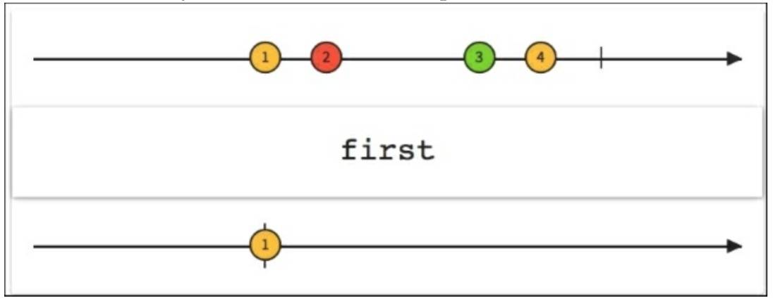 下图展示了如何从一个从可观测源序列中创建只发射第一个元素的序列。