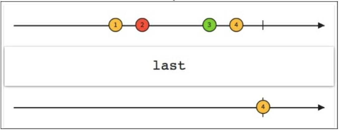 下图展示了last()应用在一个完成的序列上来创建一个仅仅发射最后一个元素的新的Observable。