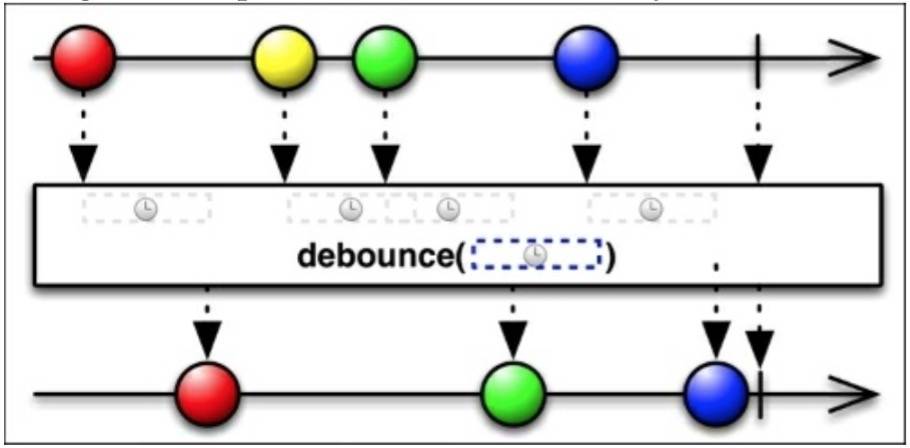 debounce()函数过滤掉由Observable发射的速率过快的数据;如果在一个指定的时间间隔过去了仍旧没有发射一个,那么它将发射最后的那个。
