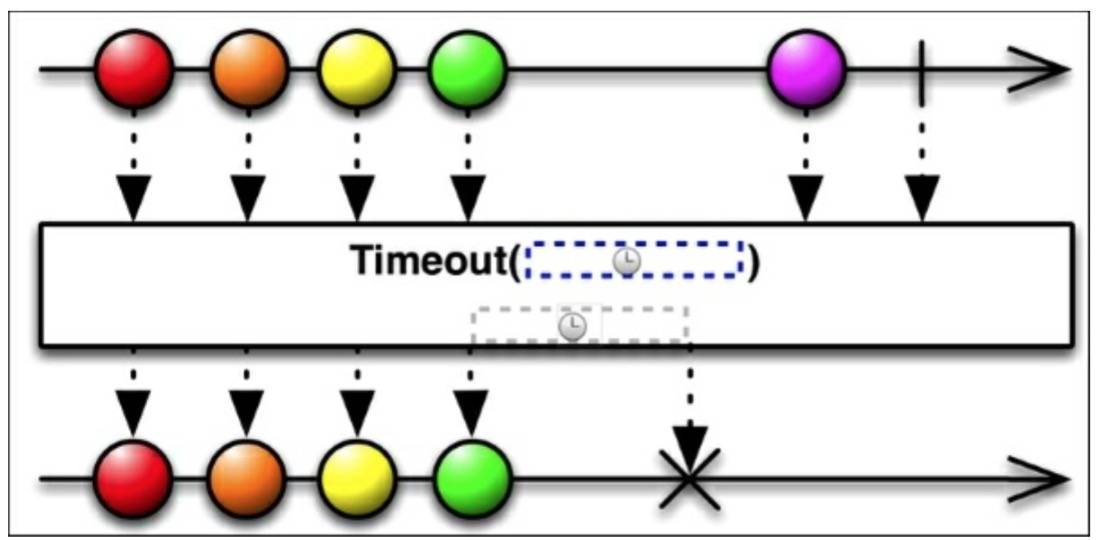 下图中展示了一旦Observable超过了限时就会触发onError()函数:因为超时后它才到达,所以最后一个元素将不会发射出去。