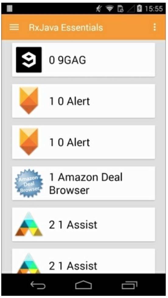 这我们使用了两个Observables:一个是每秒钟从我们已安装的应用列表发射一个App数据,第二个是每隔1.5秒发射一个Long型整数。我们将他们结合起来并执行updateTitle()函数,结果如下: