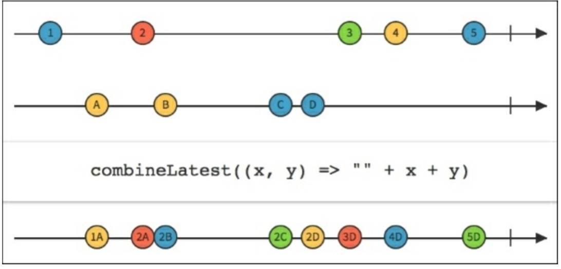 RxJava的combineLatest()函数有点像zip()函数的特殊形式。正如我们已经学习的,zip()作用于最近未打包的两个Observables。相反,combineLatest()作用于最近发射的数据项:如果Observable1发射了A并且Observable2发射了B和C,combineLatest()将会分组处理AB和AC,如下图所示: