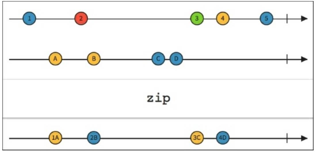 正如你看到的那样,zip()函数有三个参数:两个Observables和一个Func2。