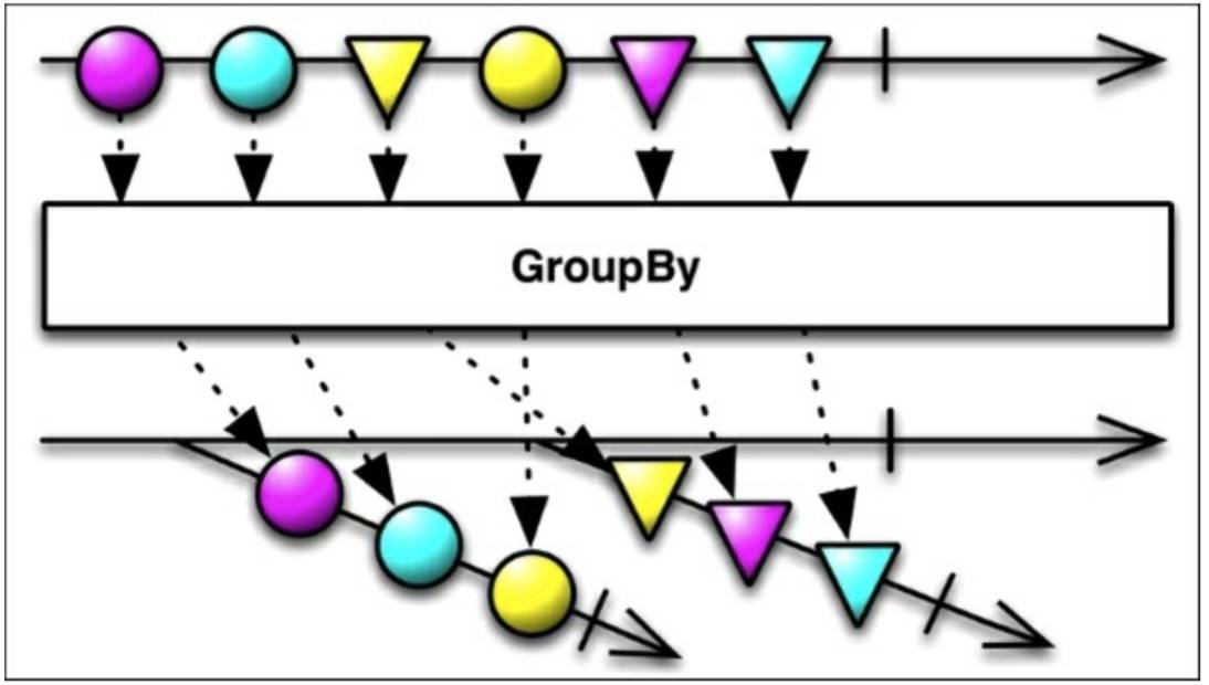 拿第一个例子开始,我们安装的应用程序列表按照字母表的顺序排序。然而,如果现在我们想按照最近更新日期来排序我们的App时该怎么办?RxJava提供了一个有用的函数从列表中按照指定的规则:groupBy()来分组元素。下图中的例子展示了groupBy()如何将发射的值根据他们的形状来进行分组。