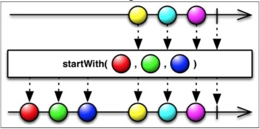 我们已经学到如何连接多个Observables并追加指定的值到一个发射序列里。RxJava的startWith()是concat()的对应部分。正如concat()向发射数据的Observable追加数据那样,在Observable开始发射他们的数据之前, startWith()通过传递一个参数来先发射一个数据序列。