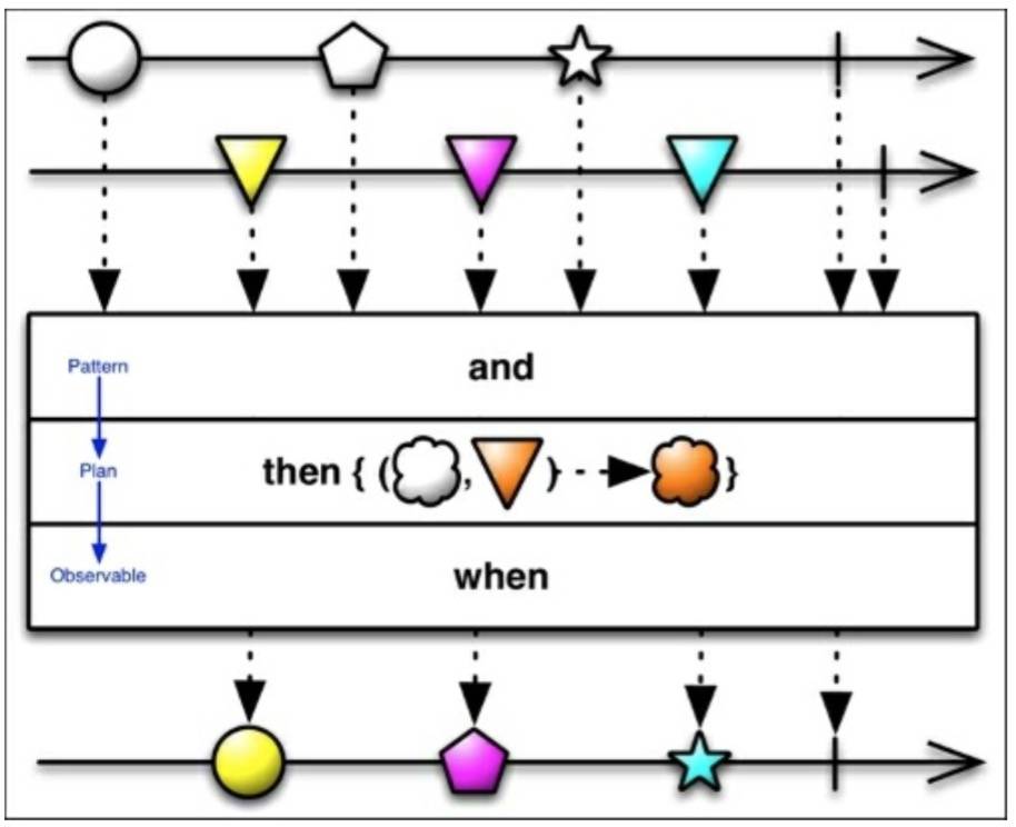在将来还有一些zip()满足不了的场景。如复杂的架构,或者是仅仅为了个人爱好,你可以使用And/Then/When解决方案。它们在RxJava的joins包下,使用Pattern和Plan作为中介,将发射的数据集合并到一起。