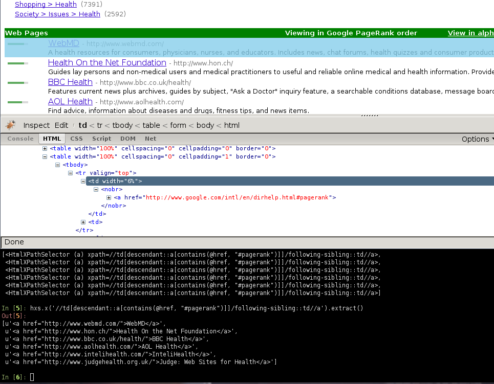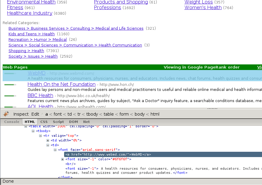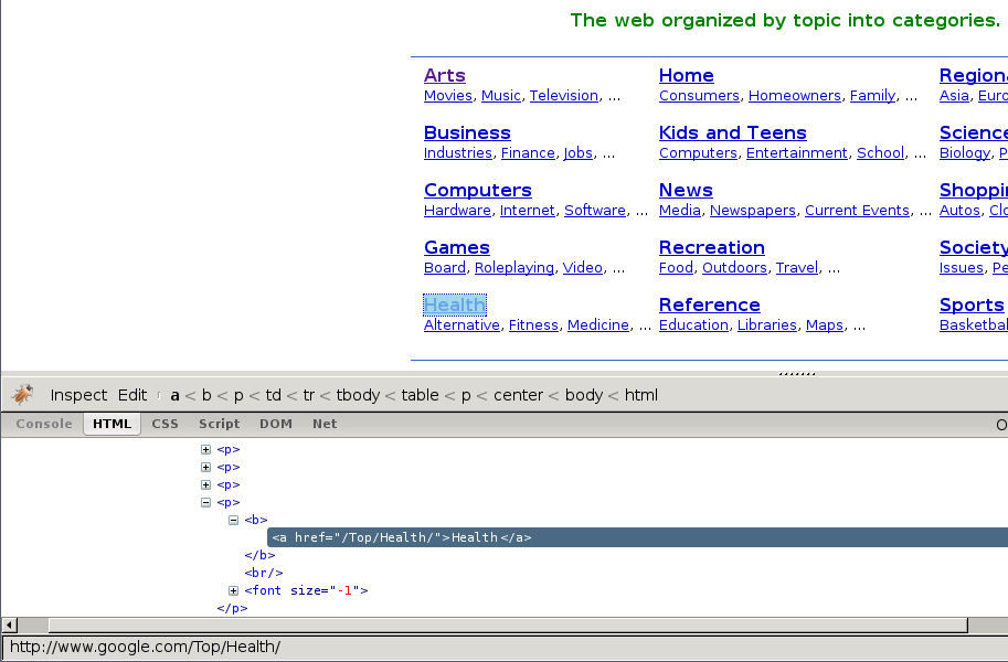在本样例中将展现如何使用 Firebug 从 Google Directory 来爬取数据。Google Directory 包含了入门教程里所使用的 Open Directory Project 中一样的数据,不过有着不同的结构。