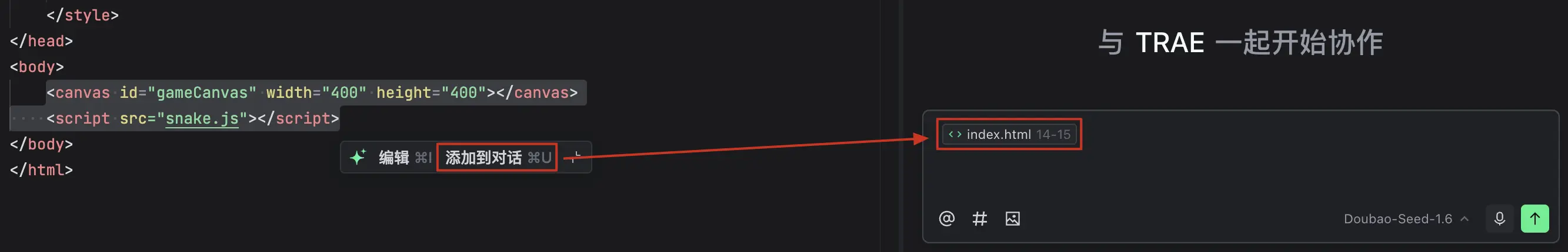 - (可选) 继续添加编辑器中的其他内容片段,或同时添加其他来源的上下文。