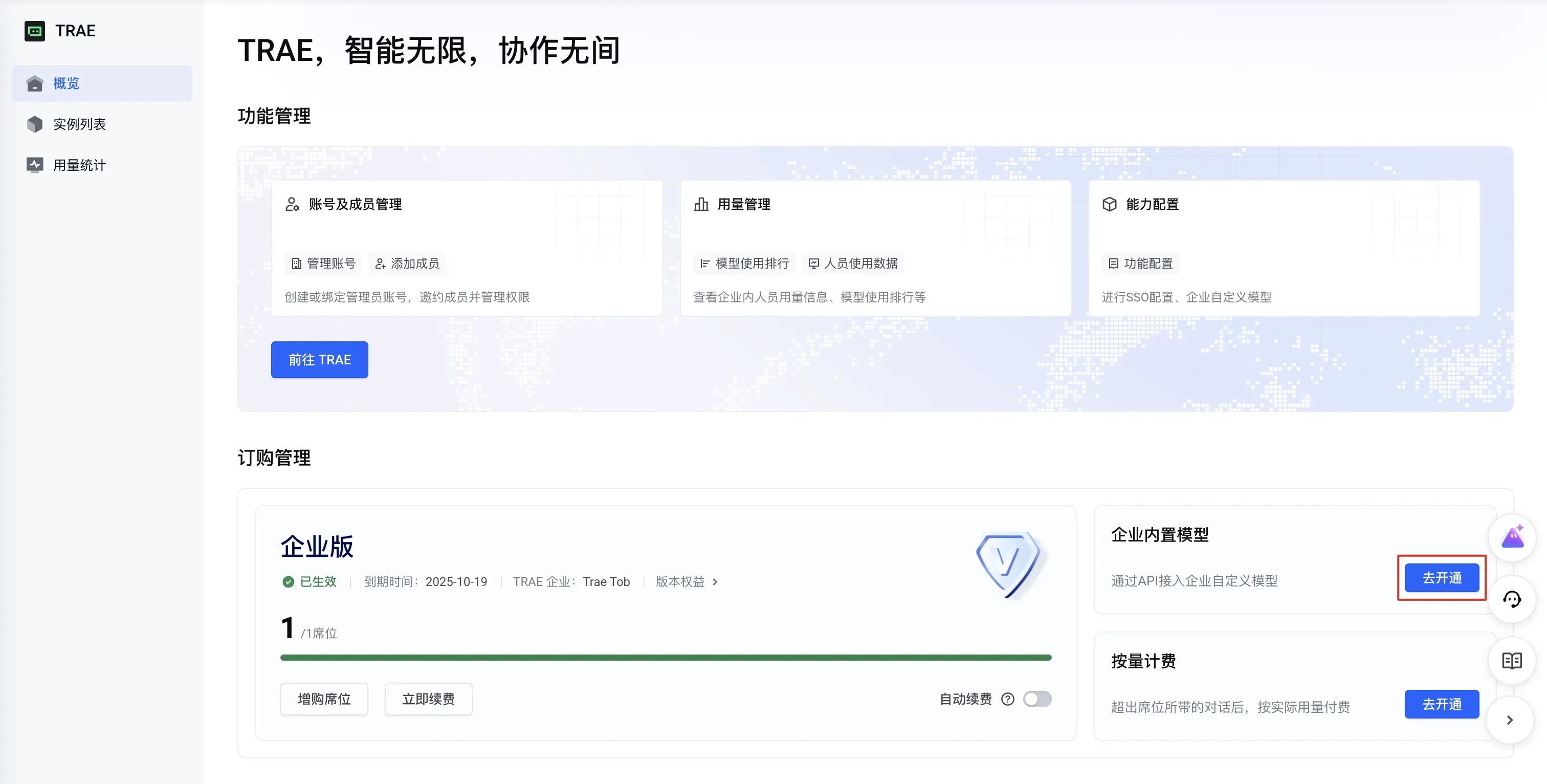 前往 TRAE 企业版在火山引擎上的控制台,开通企业内置模型功能。