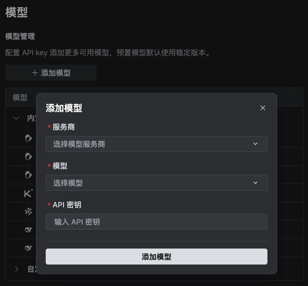 如果你希望使用预置模型之外的其它模型,或者想使用自己的模型资源,则可以通过 API 密钥连接你自己的模型资源或其他第三方模型服务商。