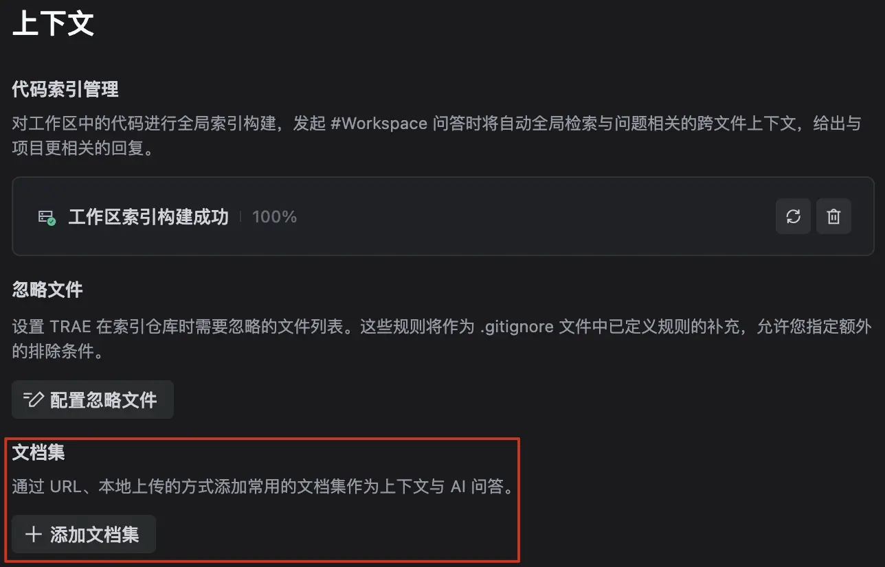 创建文档集时,TRAE 将针对文档集内容构建索引,在索引过程中文档数据将被传输至 TRAE 服务器进行矢量化,但 TRAE 不会读取或存储任何文档数据,矢量化完成后文档数据和矢量数据都将从 TRAE 的服务器中删除,数据将返回至用户的设备并存储在用户本地。在 TRAE 中删除文档集后,本地数据也将被同步删除。