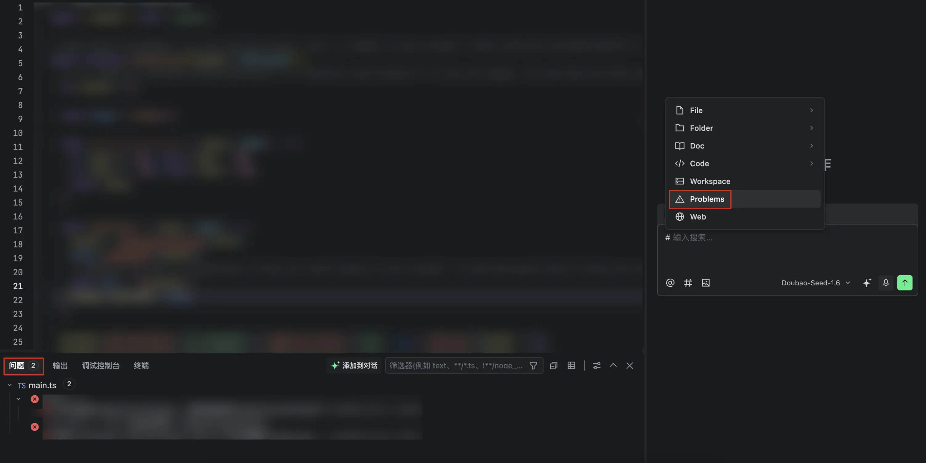 在对话框中使用 #Problems 符号并发送给 AI 后,AI 会全量分析 问题 页签中报告的所有问题并提供解决方案。
