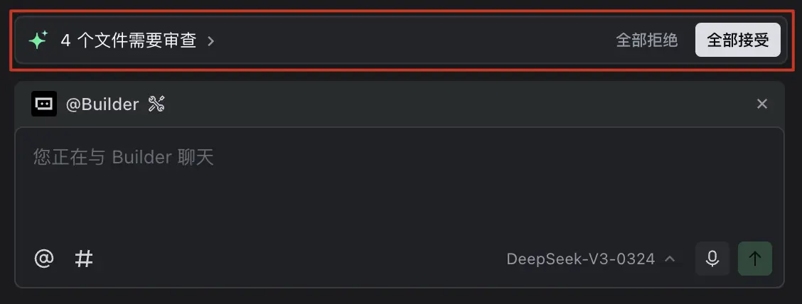 处理多文件内的所有代码变更:点击输入框上方待审查文件列表中的 全部接受 或 全部拒绝 按钮,批量接受或拒绝当前项目中的所有代码变更。