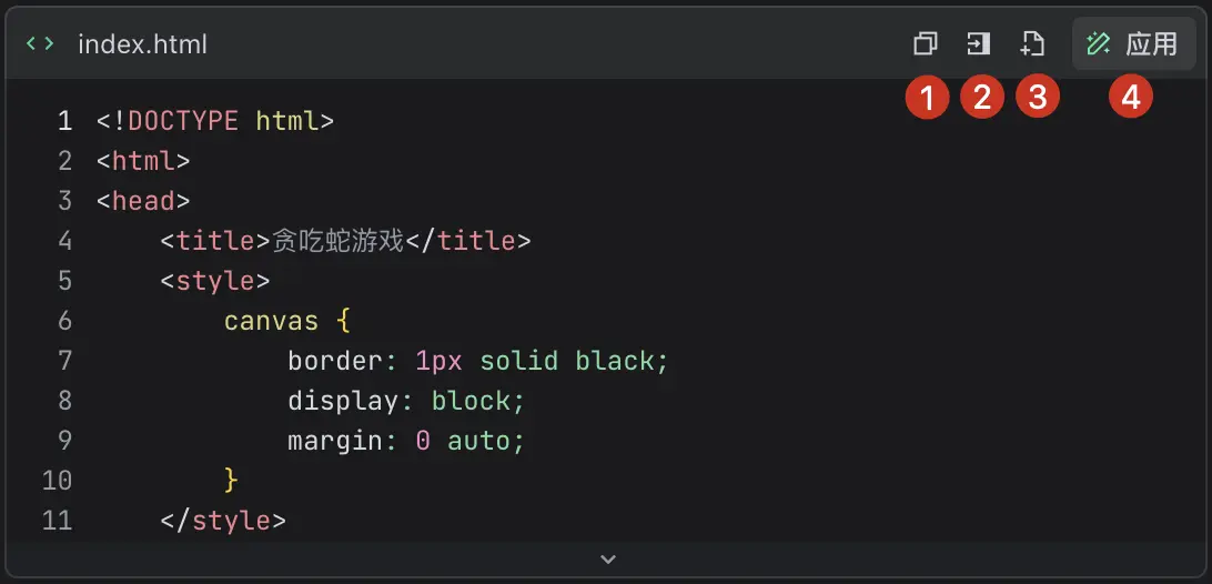 | 4 | 若为代码变更,则可以点击 应用 按钮,将变更后的代码应用至相应的文件。 提示:不支持应用和当前工作空间项目无关的代码。 |
