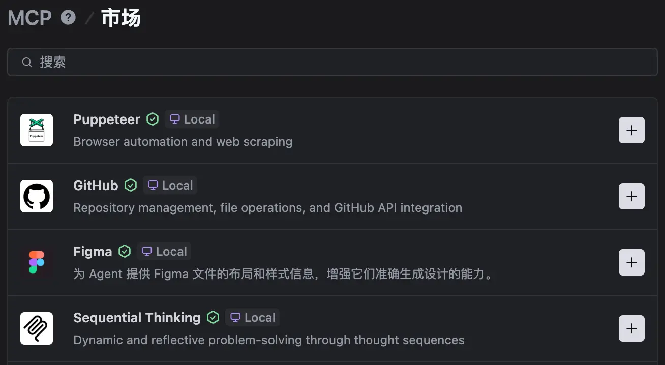 MCP 市场中提供了社区中热门的 MCP Server,你可以选择需要的 MCP Server 进行添加。