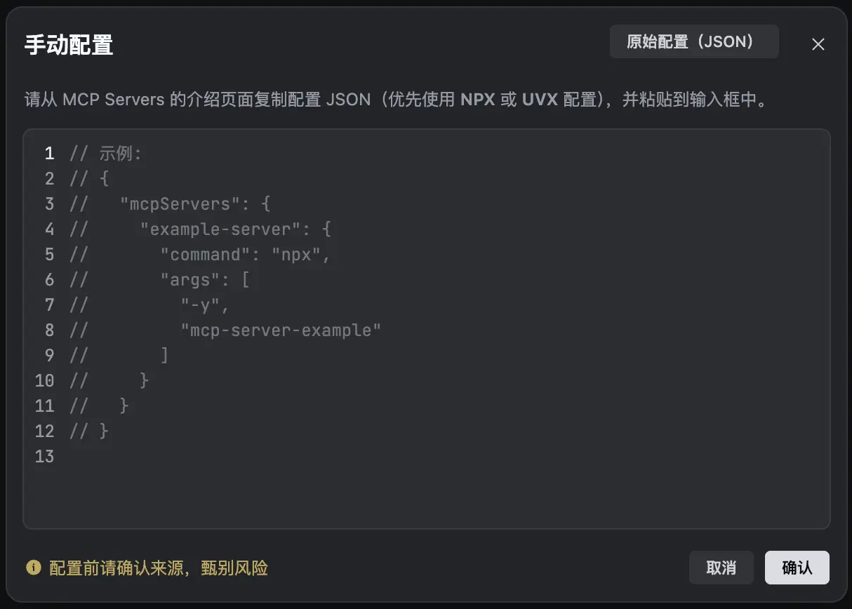 优先使用 NPX 或 UVX 配置。- 若你希望添加一个全新的 MCP Server,将 JSON 配置内容填入输入框中,然后点击 确认 按钮。该 MCP Server 将被添加至 MCP 列表中。