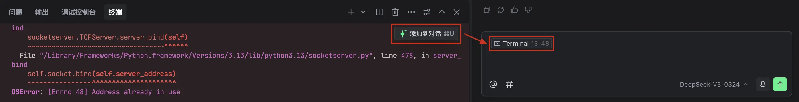 若你希望对终端中的输出内容进行提问(如帮助你修复报错),使用以下步骤: