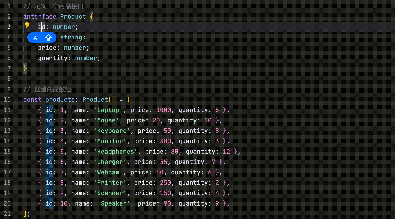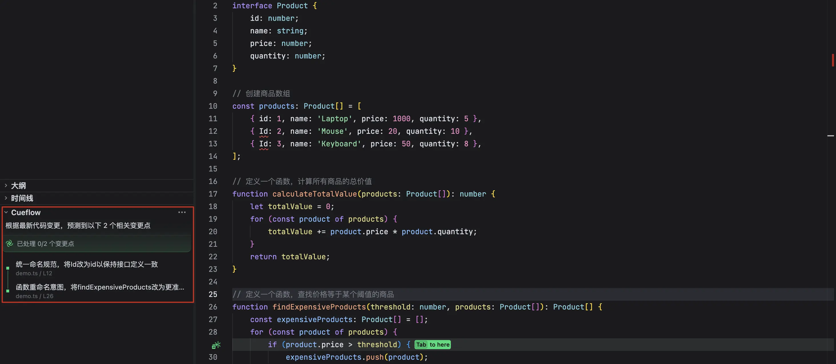 通过分析最近的代码修改、浏览记录、Linter 错误等信息,并结合当前仓库的内容,自动预测未来可能的修改点。 在以下示例中,代码定义了四个并列字段: id、name、price 和 quantity。当将 id 字段的首字母改为大写时,AI 会识别这一修改行为,并提示用户将 name、price 和 quantity 字段的首字母也一并改为大写。 |