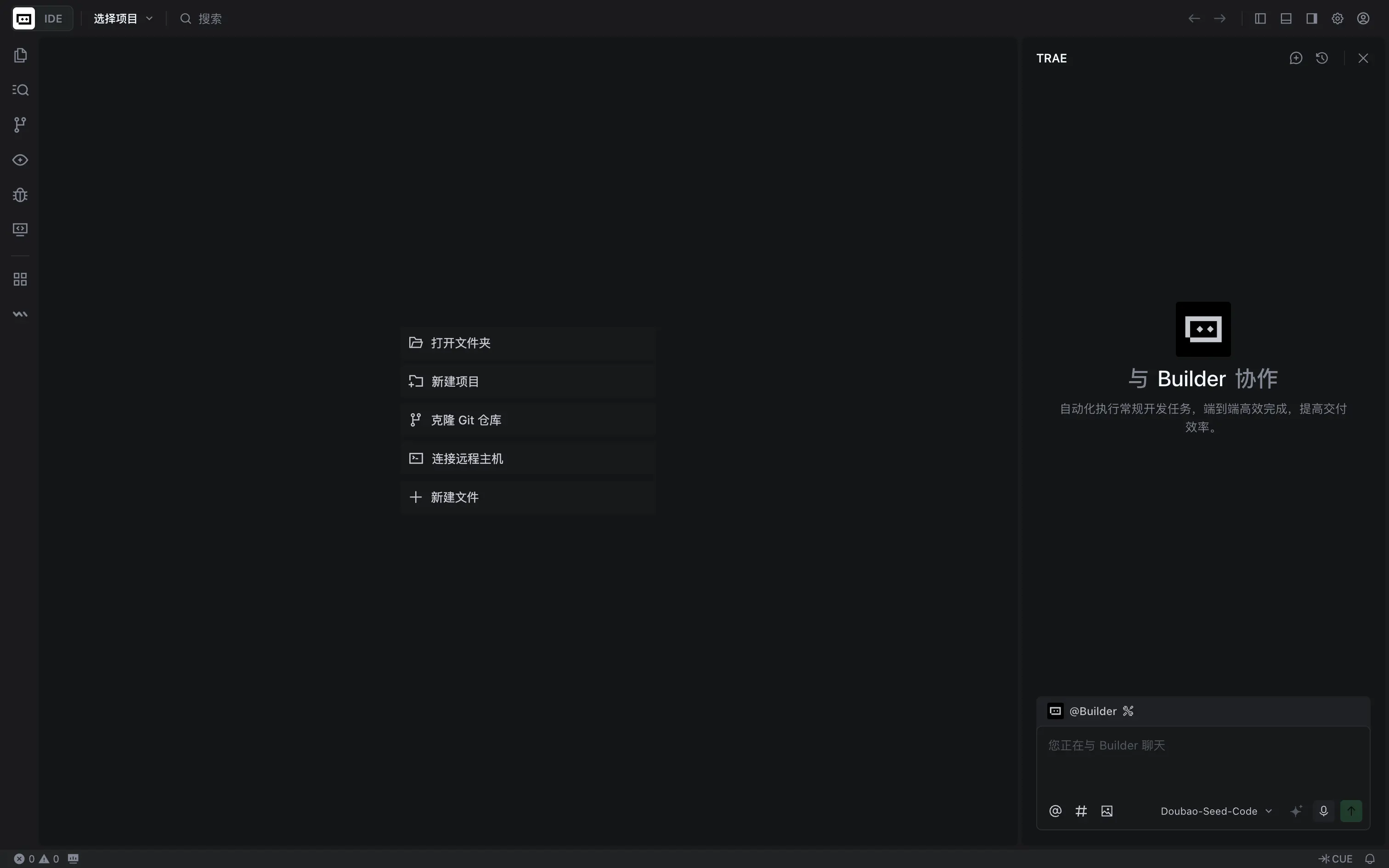 | 1. 点击左侧面板中央的 打开文件夹 按钮,或在界面左上角点击 选择项目 > 打开文件夹 。 2. 从本地选择一个文件夹并在 TRAE 中将其打开。 |