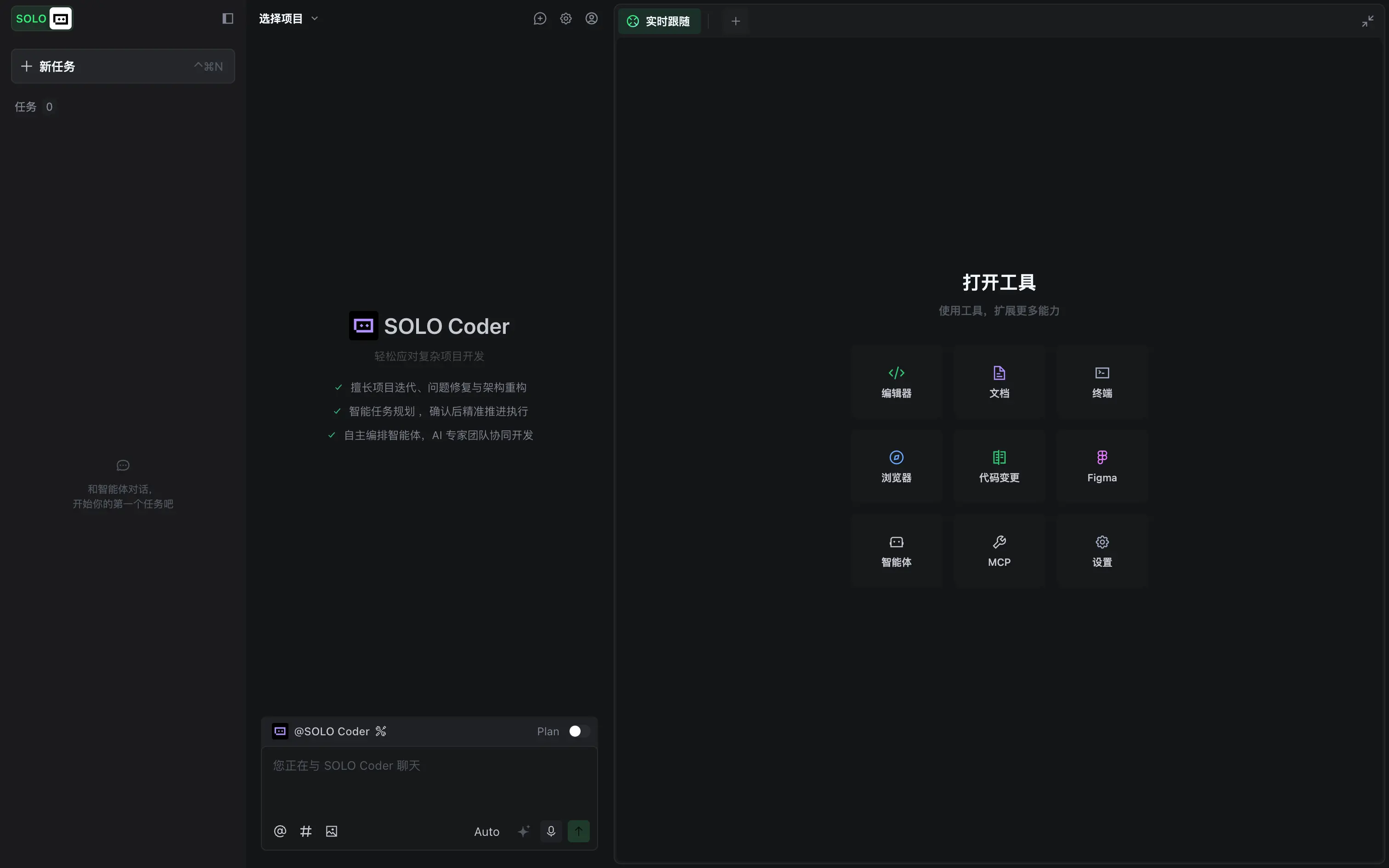- SOLO 模式:以 AI 为主导,自动规划任务并完成从需求理解、代码生成、测试,到成果预览的全流程。详情参阅 SOLO 模式概览。