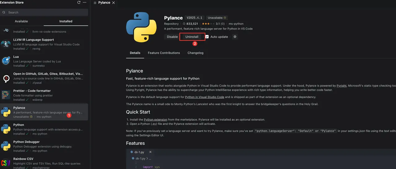 若已安装了由 ms-python 提供的 Pylance 插件,将其卸载。